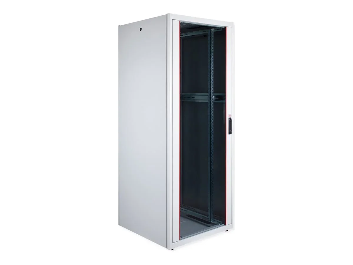 ROLINE 19 Zoll Netzwerkschrank Pro 42 HE 800x800 BxT Glastür grauDie Netzwerkschränke der ROLINE Pro Serie wurden entwickelt, um eine besonders komfortable und flexible Netzwerkverkabelung zu ermöglichen. Mit Bürsteneinlässen im Dach- und Bodenbereich (ab 26HE und 800 mm Schrankbreite), einem aufschiebbaren Einlass im Bodenchassis mit Moosgummidichtung sowie Bürstenleisten ober- und unterhalb der Rücktür (ab 26HE) bieten sie vielseitige Einsatzmöglichkeiten für verschiedene Anwendungsszenarien. Vertikale Kabelführungskanäle mit Blende, installiert neben den Profilschienen (ab 800 mm Schrankbreite), vervollständigen das Design. Ein abgesetzter, abnehmbarer Deckel mit Lüftungsschlitzen verbessert die Luftzirkulation und ermöglicht eine einfache Installation eines Lüftermoduls. Die Lüftereinheit kann von oben ein- und ausgebaut werden, ohne dass die Komponenten im Inneren betroffen sind. Im Inneren sind zwei Paar galvanisierte 19"-Profilschienen verbaut, die in beide Richtungen ablesbar und in der Tiefe verstellbar sind. Sie sind zudem mit zusätzlichen Tiefenstreben im Schrank verbunden. Jeder Schrank besteht aus einer robusten Stahlkonstruktion mit einer Materialstärke von bis zu 1,5 mm Stahlblech.Die Farbgebung erfolgt mittels elektrostatischer Pulverbeschichtung in den Standardfarben Grau (RAL 7035) und Schwarz (RAL 9005). Modular abnehmbare Seitenwände und Türen verbessern die Zugänglichkeit. Ein Wechsel des Türanschlags ist möglich. Die Schränke sind bei Bedarf auch vollständig zerlegbar.