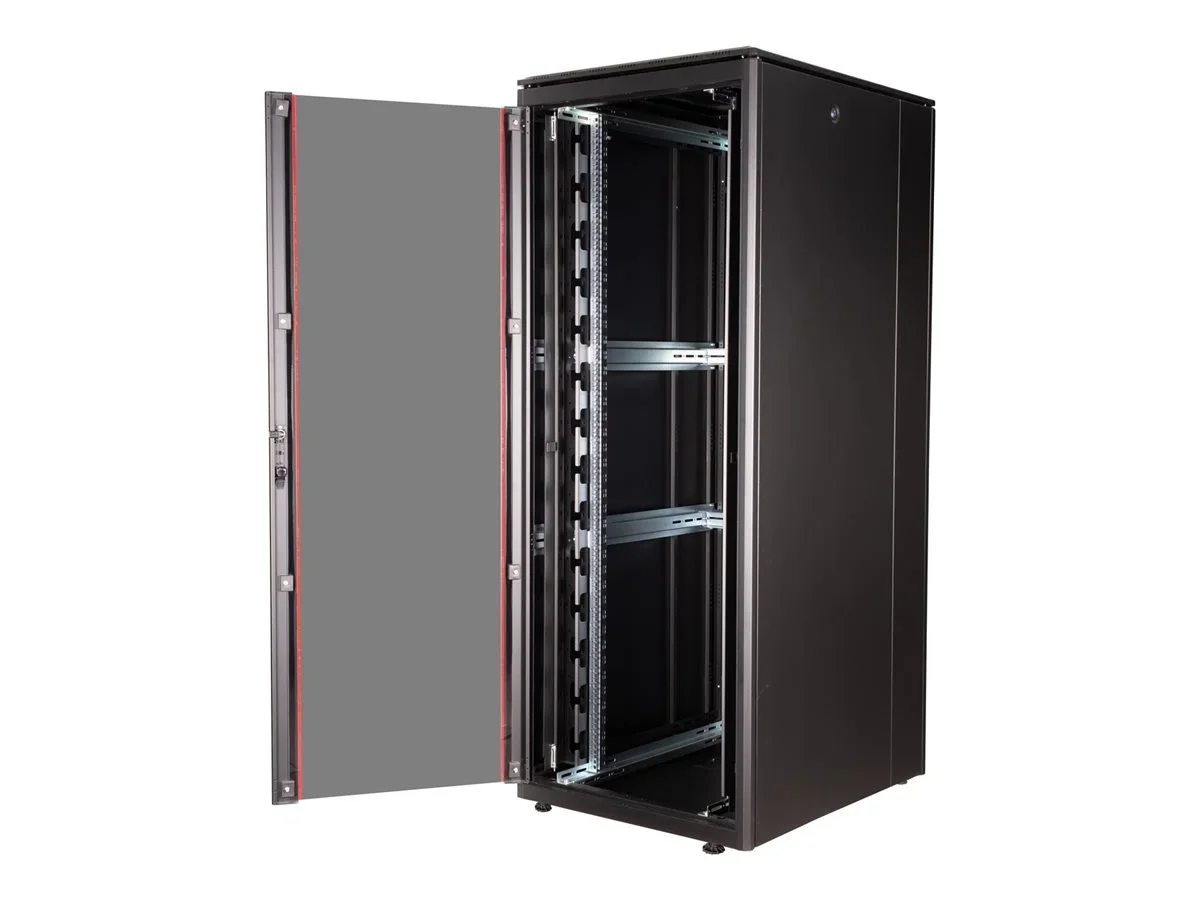 ROLINE 19 Zoll Netzwerkschrank Pro 42 HE 800x1000 BxT Glastür schwarzDie Netzwerkschränke der ROLINE Pro Serie wurden entwickelt, um eine besonders komfortable und flexible Netzwerkverkabelung zu ermöglichen. Mit Bürsteneinlässen im Dach- und Bodenbereich (ab 26HE und 800 mm Schrankbreite), einem aufschiebbaren Einlass im Bodenchassis mit Moosgummidichtung sowie Bürstenleisten ober- und unterhalb der Rücktür (ab 26HE) bieten sie vielseitige Einsatzmöglichkeiten für verschiedene Anwendungsszenarien. Vertikale Kabelführungskanäle mit Blende, installiert neben den Profilschienen (ab 800 mm Schrankbreite), vervollständigen das Design. Ein abgesetzter, abnehmbarer Deckel mit Lüftungsschlitzen verbessert die Luftzirkulation und ermöglicht eine einfache Installation eines Lüftermoduls. Die Lüftereinheit kann von oben ein- und ausgebaut werden, ohne dass die Komponenten im Inneren betroffen sind. Im Inneren sind zwei Paar galvanisierte 19"-Profilschienen verbaut, die in beide Richtungen ablesbar und in der Tiefe verstellbar sind. Sie sind zudem mit zusätzlichen Tiefenstreben im Schrank verbunden. Jeder Schrank besteht aus einer robusten Stahlkonstruktion mit einer Materialstärke von bis zu 1,5 mm Stahlblech.Die Farbgebung erfolgt mittels elektrostatischer Pulverbeschichtung in den Standardfarben Grau (RAL 7035) und Schwarz (RAL 9005). Modular abnehmbare Seitenwände und Türen verbessern die Zugänglichkeit. Ein Wechsel des Türanschlags ist möglich. Die Schränke sind bei Bedarf auch vollständig zerlegbar.
