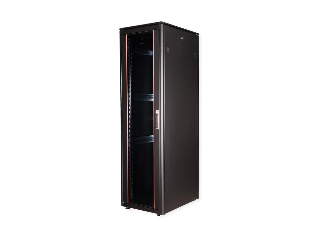 ROLINE 19 Zoll Netzwerkschrank Pro 47 HE 600x800 BxT Glastür schwarzDie Netzwerkschränke der ROLINE Pro Serie wurden entwickelt, um eine besonders komfortable und flexible Netzwerkverkabelung zu ermöglichen. Mit Bürsteneinlässen im Dach- und Bodenbereich (ab 26HE und 800 mm Schrankbreite), einem aufschiebbaren Einlass im Bodenchassis mit Moosgummidichtung sowie Bürstenleisten ober- und unterhalb der Rücktür (ab 26HE) bieten sie vielseitige Einsatzmöglichkeiten für verschiedene Anwendungsszenarien. Vertikale Kabelführungskanäle mit Blende, installiert neben den Profilschienen (ab 800 mm Schrankbreite), vervollständigen das Design. Ein abgesetzter, abnehmbarer Deckel mit Lüftungsschlitzen verbessert die Luftzirkulation und ermöglicht eine einfache Installation eines Lüftermoduls. Die Lüftereinheit kann von oben ein- und ausgebaut werden, ohne dass die Komponenten im Inneren betroffen sind. Im Inneren sind zwei Paar galvanisierte 19"-Profilschienen verbaut, die in beide Richtungen ablesbar und in der Tiefe verstellbar sind. Sie sind zudem mit zusätzlichen Tiefenstreben im Schrank verbunden. Jeder Schrank besteht aus einer robusten Stahlkonstruktion mit einer Materialstärke von bis zu 1,5 mm Stahlblech.Die Farbgebung erfolgt mittels elektrostatischer Pulverbeschichtung in den Standardfarben Grau (RAL 7035) und Schwarz (RAL 9005). Modular abnehmbare Seitenwände und Türen verbessern die Zugänglichkeit. Ein Wechsel des Türanschlags ist möglich. Die Schränke sind bei Bedarf auch vollständig zerlegbar.