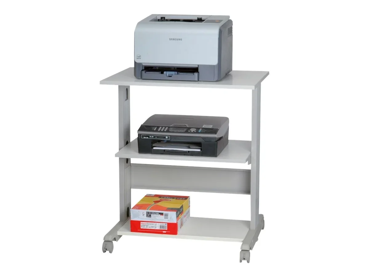 Stabiler Druckertisch mit drei Ebenen und vier Rollen Stabiles Metall-/ Kunststoffgestell Druckerebene (B×T: 68×50cm) Zwischenebene (B×T: 58,5×44cm) Bodenplatte (B×T: 57,5×31,5cm) Mobil durch 4 Rollen, davon 2 feststellbar Belastbarkeit: bis 30kg Farbe Gestell: lichtgrau Farbe Platte: weiss (Plattenumrandung: grau) Abmessungen (H×B×T): 77,5×68×54cm Montageart bei Lieferung: zerlegt Gewicht: 16 kg.