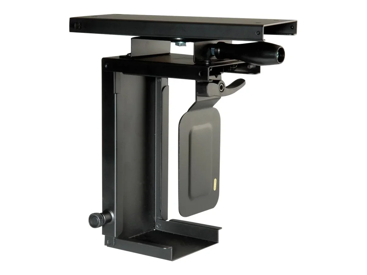 Stabiler PC Halter zur Untertischmontage für mehr Platz auf Ihrem Arbeitstisch Platzsparender PC Halter, schafft mehr Platz auf Ihrem Arbeitstisch Stabile Stahlkonstruktion, drehbar bis 180°, ausziehbar bis 13cm Befestigung unter der Tischplatte (mind. 15mm), Schrauben nicht im Lieferumfang Tragkraft: 10 kg Höhenverstellbar: 200-358mm Breitenverstellbar: 50-100mm Herausziehbar: Ja Drehbar: 180°.