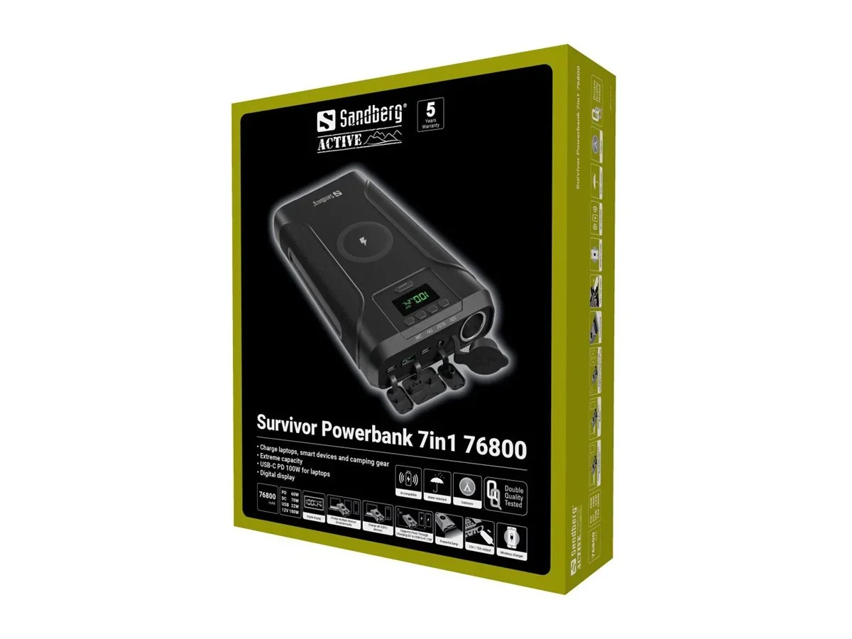 Die Sandberg Survivor 7in1 Powerbank wurde für Vielseitigkeit und Zuverlässigkeit entwickelt und ist somit ein idealer Begleiter für eine Vielzahl von Geräten, darunter Kameras, Tablets, Mobiltelefone und Laptops. Mit einem robusten Lithium-Ionen-Akku mit einer Kapazität von 76800 mAh sorgt diese Powerbank dafür, dass Sie unterwegs genügend Strom haben, um Ihre Geräte aufgeladen und einsatzbereit zu halten.