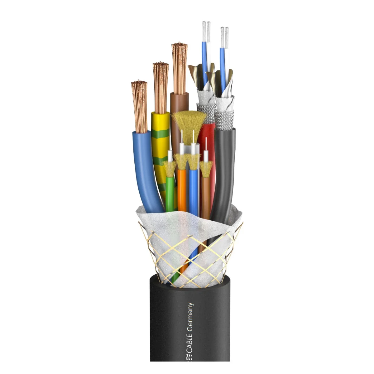Universal Fiber-Power..ist hier mit 4 x OM3-Multimode, 3 x 2.50 mm² (16 A/240 VDC) und 2 x 2 x AWG24 für 4 x Control oder 2 x AES/EBU realisierbar. Das ganze rundum stabil geschützt durch ein dichtes Aramidgeflecht und einen kälteflexiblen PUR-Mantel.…