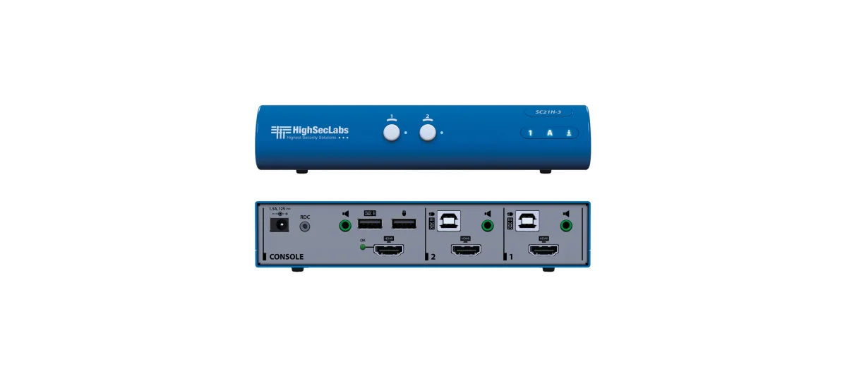 SC21H−3 ist ein sicherer 2−Port 4K30 UHD HDMI KVM−Combiner. Er ermöglicht Benutzern, Peripheriegeräte (Tastatur, Video, Maus, Audio und USB) zwischen zwei verschiedenen Netzwerken/Computern auf Sicherheitsniveau zu teilen und gleichzeitig alle Hosts zu isolieren und vor Datenlecks und bösartigen Angriffen durch gemeinsame Peripheriegeräte zu schützen. Erweiterte Multiviewer− und Skalierungsfunktionen ermöglichen eine erhöhte Produktivität in Umgebungen, in denen mehrere Computer gleichzeitig angezeigt und interagiert werden müssen. SC21H−3 bietet die höchstmögliche Isolation zwischen angeschlossenen Computern und wurde entwickelt, um die Sicherheitsanforderungen von Regierungsbehörden, Militär, Finanzinstituten und ähnlichen sicherheitsempfindlichen Kunden zu erfüllen.
