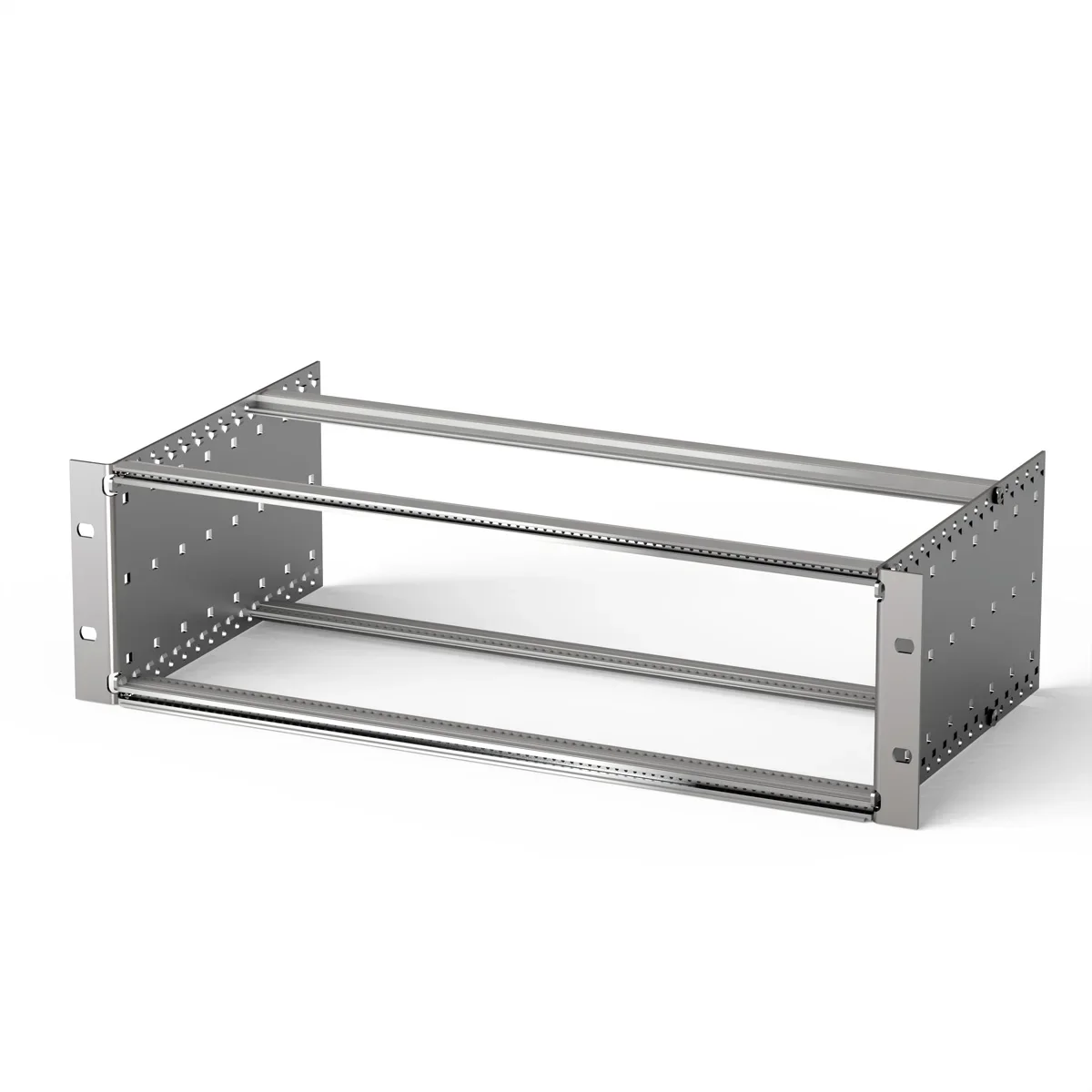 Ungeschirmter Baugruppenträger für Backplanemontage, Ausführung Light. Baugruppenträger mit Seitenwand Typ L („leicht“) mit integrierten 19''-Befestigungswinkeln. Modulschiene Typ „light“. Aluminium. Modulschienen hinten zur Backplanemontage mit Isolierstreifen