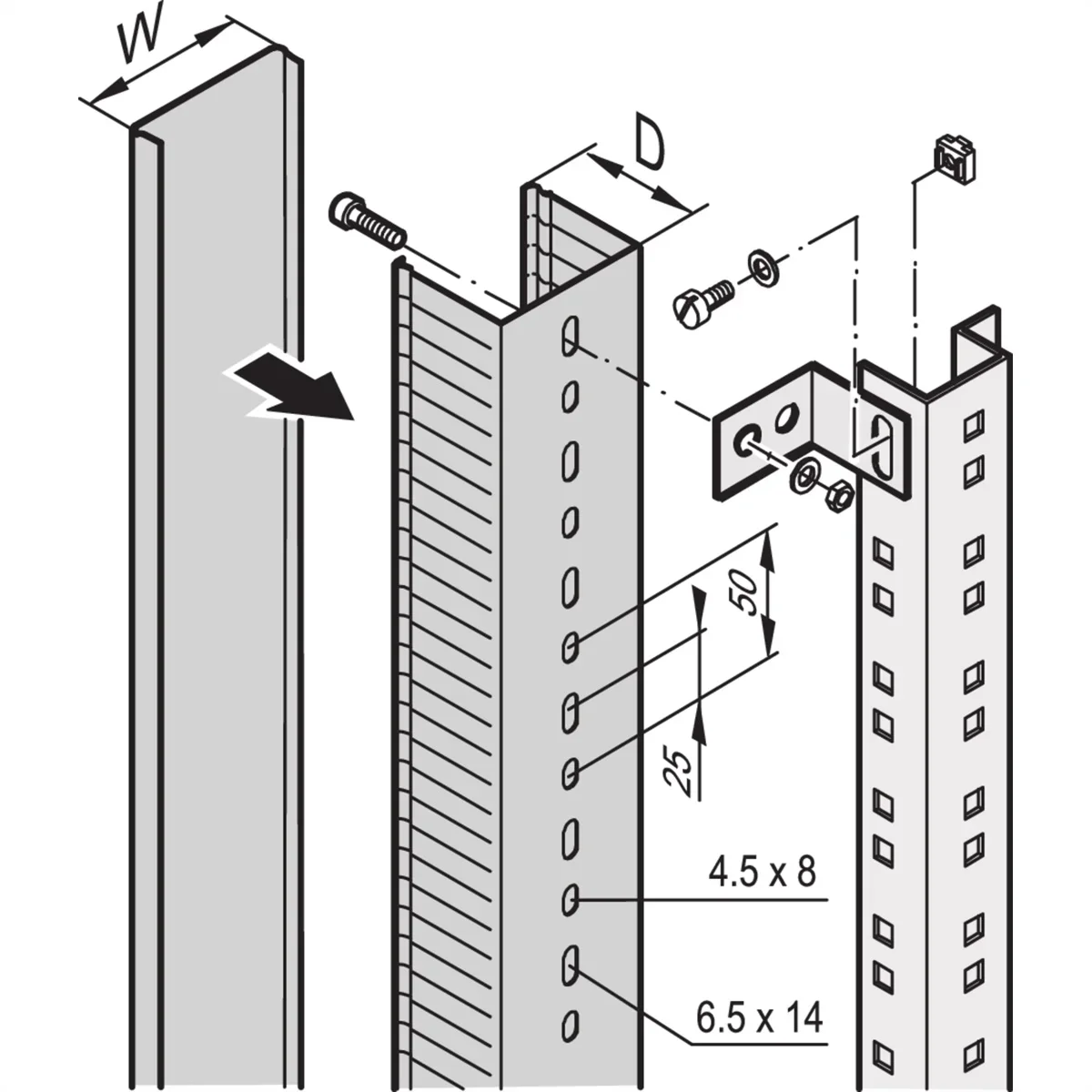 Zur Kabelführung im seitlichen und hinteren Schrankbereich - Montage an Schrankholmen, Tiefenstreben oder C-Profilen - Befestigungsmaterial für Kabelkanal bitte separat bestellen