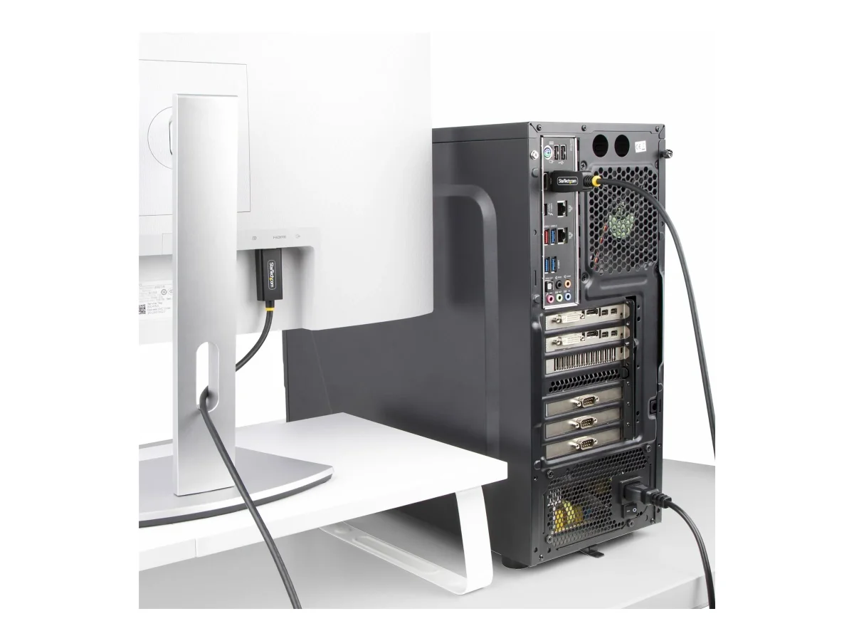 Das integrierte Videoadapterkabel reduziert Fehlerquellen, Signalverluste und Unordnung und erfordert keine zusätzliche Stromversorgung. Ausgestattet mit adaptiver Empfängerentzerrung zur Optimierung des Eingangssignals und Verstärkung des Ausgangssignals, um die Kompatibilität mit Bildschirmen zu gewährleisten. Die Käfigabschirmung verhindert elektromagnetische Interferenzen (EMI) und hilft, die Signalintegrität zu erhalten. Dieses aktive Adapterkabel funktioniert mit Computern von Dell, HP, Lenovo und anderen Desktop-Herstellern. Es ist rückwärtskompatibel mit 4K 30Hz, 1080p und anderen niedrigeren Auflösungen.