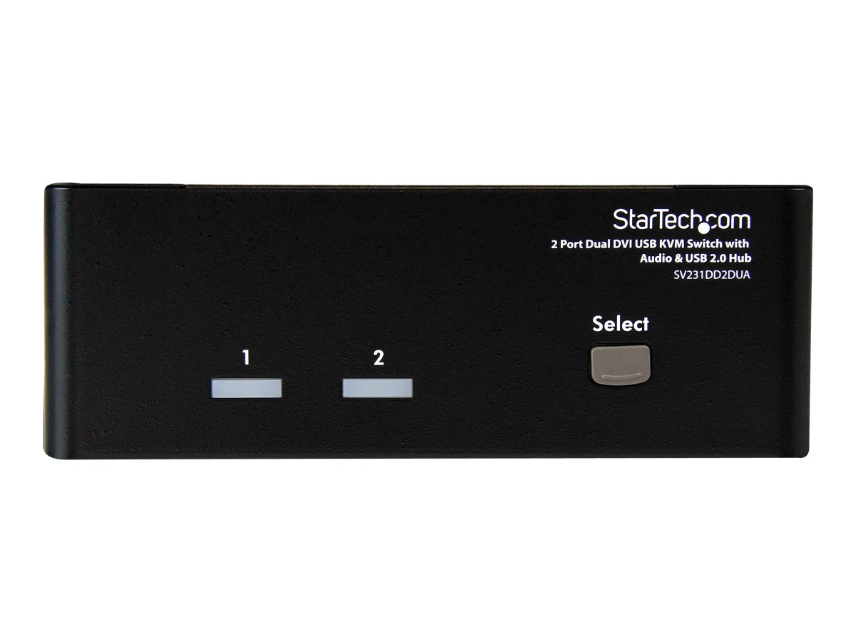 Mit dem 2-Port Dual DVI USB KVM-Switch SV231DD2DUA können zwei PCs mit jeweils zwei DVI-Videoausgängen zwei Monitore, ein Mikrofon und einen Satz Lautsprecher, eine Tastatur und Maus sowie zwei weitere USB-Peripheriegeräte gemeinsam verwenden.