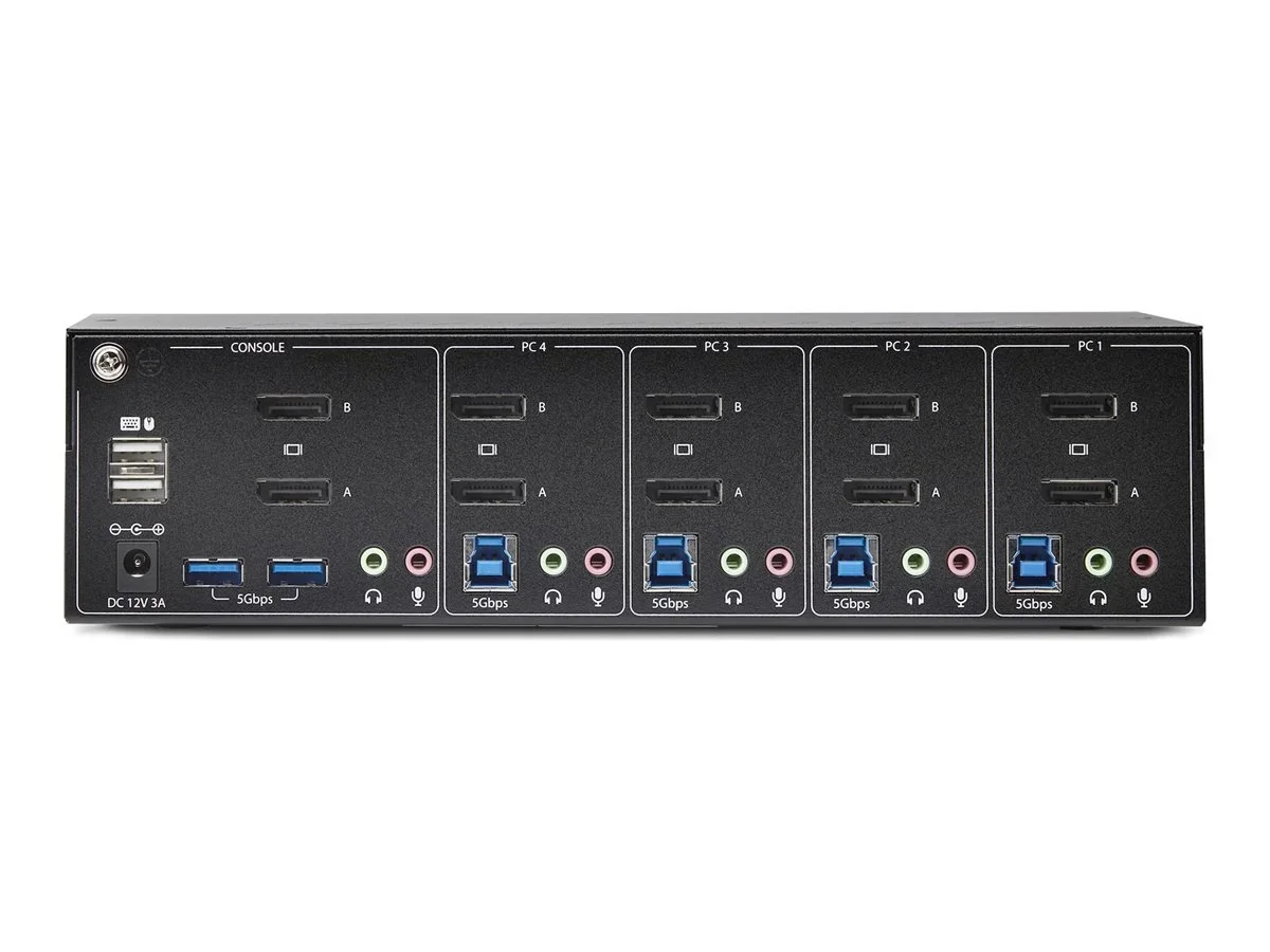 Mit diesem Dual-Monitor KVM-Switch können Sie zwischen vier Computer mit USB-A und DisplayPort-Anschluss umschalten. Er ermöglicht die gemeinsame Nutzung von zwei 4K 60Hz DisplayPort-Monitoren, einer Tastatur und Maus sowie zwei USB 5Gbps Geräten.