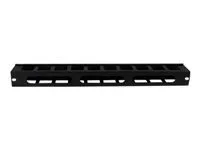 Die Kabelführung dient als entfernbare obere Abdeckung, so dass gebündelte Kabel schnell und einfach hinzugefügt oder entfernt werden können. Der Kanal hat an jeder Seite eine Reihe von Fingern und Durchlässe an der Rückseite, damit Sie Kabel dort entlang führen können, wo Sie sie benötigen, und dabei die Kabel entlasten können.