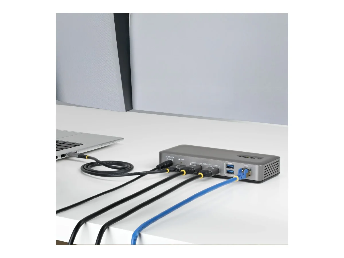 Schließen Sie bis zu zwei 4K 60Hz HDMI Displays über einen einzigen USB-C Port an und nutzen Sie zusätzlich USB-C, USB-A sowie Gigabit-Ethernet Konnektivität. Unkomprimiertes Video über USB-C Verbinden Sie bis zu zwei 4K 60Hz HDMI Monitore über einen einzelnen USB-C Port mit einem unkomprimierten Videosignal, das direkt von der nativen GPU des Laptops bereitgestellt wird. Ideal für anspruchsvolle Workflows mit hoher Bildqualität ganz ohne Software Kompression. Treiberlose Bereitstellung Unterstützt Plug-and-Play unter Windows ohne Treiber oder zusätzliche Software*. Entwickelt für skalierbare Zero Touch Rollouts in Shared Workspaces, Unternehmensumgebungen und BYOD Szenarien. Flexible High Speed I/O Die Dockingstation verfügt über 4× USB-A Ports mit 5 Gbps sowie 2× USB-C Ports mit 10 Gbps, davon einer mit 15W Power Delivery. Damit lassen sich sowohl ältere Peripheriegeräte als auch moderne Geräte mit hohem Datendurchsatz ohne Leistungseinbußen anbinden. Ein Gigabit Ethernet Port sorgt für eine zuverlässige kabelgebundene Netzwerkverbindung. Montage und Sicherheit Diese Multi Monitor Dockingstation bietet integrierte Lock Slots für erhöhte physische Sicherheit und unterstützt Oberflächen- oder VESA-Montage, um das Dock platzsparend und sicher zu befestigen. Montagezubehör ist separat erhältlich (SSPMSUDWM, DOCK-NUC-VESA-MOUNT, SSPMSVESA). *Hinweis: Nicht kompatibel mit macOS oder ChromeOS.