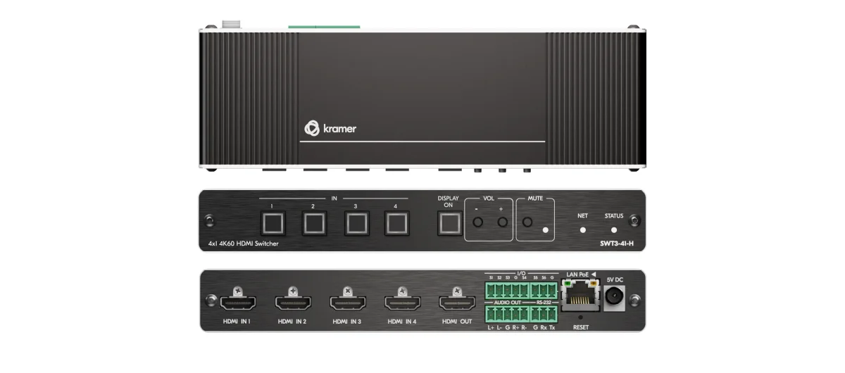 - Built–in Intelligent Control Gateway — Remote IP–driven intelligent control of connected HDMI and sensor devices via RS–232 or I/O. Eliminating the need for an external control gateway, this feature reduces installation complexity and costs, to enable easy integration with control systems, such as Kramer Control.