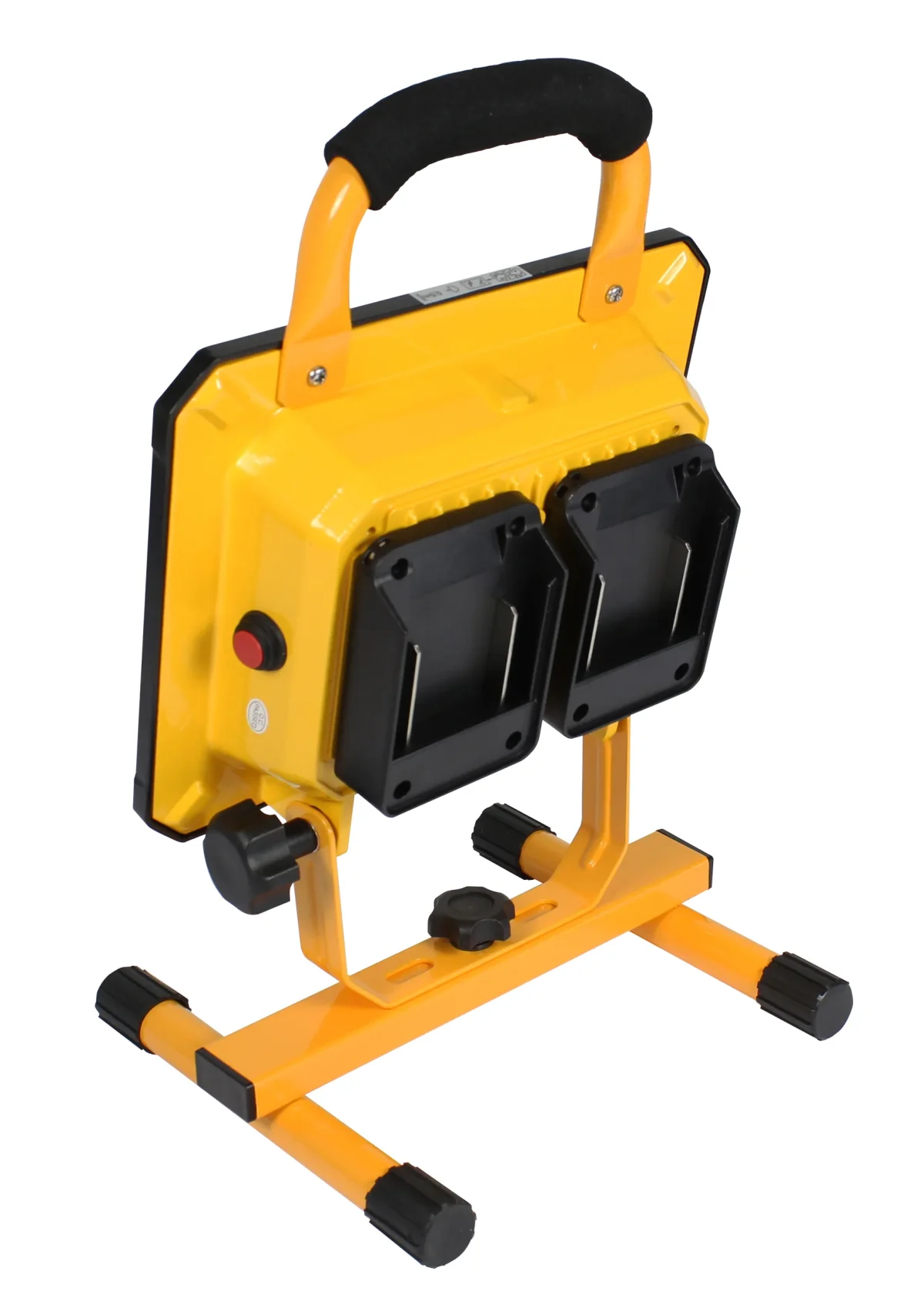 AKKU LED Baustrahler mit Tragegestell. LED: 30Watt Abstrahlwinkel: 120° Kelvin: 5500-6000K Lumen: 2700, 90lm/W Input voltage: DC 18V Dimmbar: ja (in 3 Schritten) CRI:>80 Lichtfarbe: Kaltweiss Gehäuse: Alu Spritzguss in gelb Arbeitstemperatur: -20°C bis +55°C Schutzklasse: IP44 Abmessungen: (l*b*h) 220*200*345mm Adapter input: 100-240V AC 50/60HZ