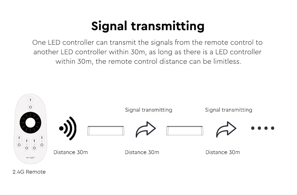 MiBoxer FUT035S+ 2in1 LED Controller 2.4GHz RF Der MiBoxer FUT035S+ ist ein 2in1 LED Controller zur Steuerung von Dual White (CCT) LED-Strips mit Dim-Funktion. Die Ansteuerung erfolgt über 2.4GHz RF Funk und eignet sich für flexible Lichtinstallationen im Wohn- und Gewerbebereich. Funktionen 2in1 Unterstützung: Dual White (CCT) & Dimmen Steuerung über 2.4GHz RF Reichweite: bis zu 30m Helligkeits- und Weißtonregelung Common Anode Ausgang Technische Daten Modell: FUT035S+ Betriebsspannung: DC 12–24V Ausgangsstrom: max. 12A Gesamtleistung: max. 12A Funkfrequenz: 2.4GHz Sendeleistung: 6dBm Arbeitstemperatur: -10°C bis +40°C Ausgangsanschluss: Common Anode / DC 5.5 × 2.1 mm Einsatzbereiche Geeignet für Dual White LED-Strips in Wohnräumen, gewerblichen Installationen und 2.4GHz RF Lichtsystemen.