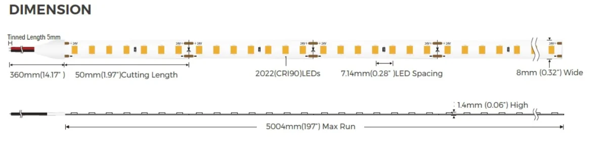 Synergy 21 LED Flex Strip Serie mit 2022 Chip Spannung: 24V, Watt: 9,6W/m 48W gesamt Lichtfarbe: warmweiss , 3000K, CRI>90 Helligkeit: 110Lm/W, 1056Lm/m, gesamt: 5280Lm Abstrahlwinkel: 120° Schutzklasse: IP20 LED Anzahl: 140LEDs/m, Gesamt: 700LEDs LED Type: 2022 Schnittmaß:50mm Maße LED Strip: 5000*8*2 mm Arbeitstemperatur: -25°C bis +40°C Klebeband: ja 3M rückseitig Achten sie darauf, dass der LED Strip die Arbeitstemperatur von 40°C nicht überschreitet, da sonst die Lebensdauer nicht gewährleistet werden kann. Auf überhitzte LED Strips kann keine Garantie gewährt werden.