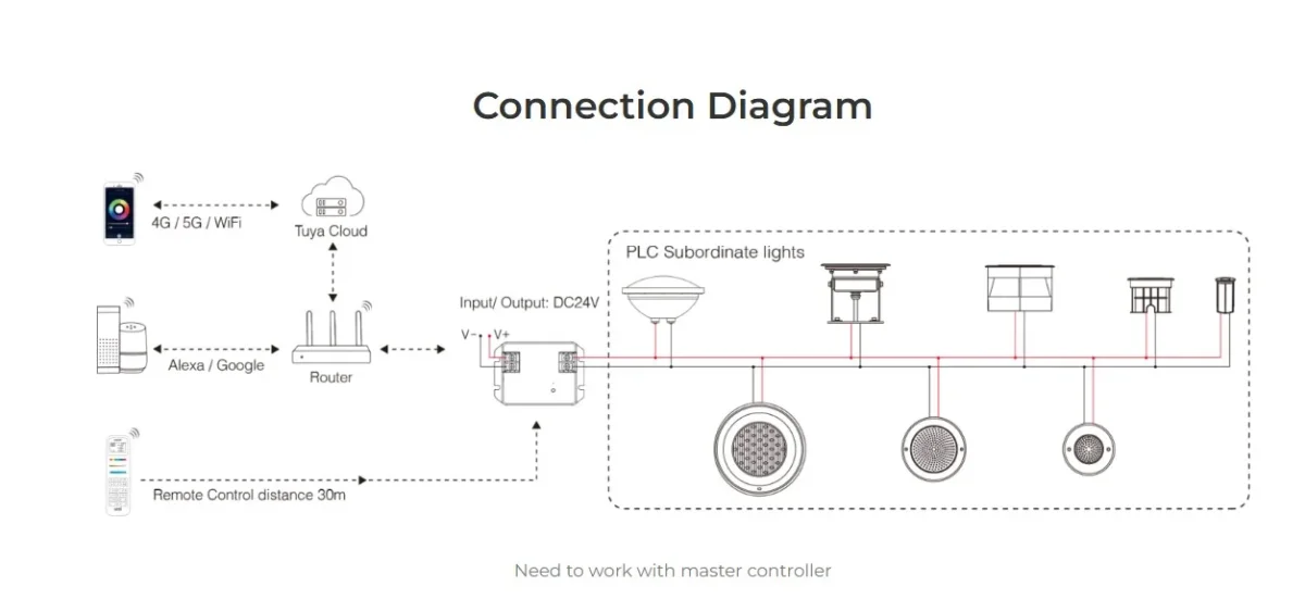 PLC-PA1 30W RGB+CCT PAR56 LED Pool Light (PLC) • 16 million colors for selection, dimmable for rgb& cct& brightness • Brightness and color temperature adjustable • Working with master controller to adjust rgb& cct& brightness& saturation • IP68 waterproof(Need the cover) Features Designed by PLC control solution, simple wiring diagram. Working with master controller control to dim brightness, create scenes, timer, music rhythm, biological rhythm, sleeping mode…etc, support 2.4G remote control as well. Parameters 16 million colors for selection, dimmable for rgb& cct& brightness Working with master controller to adjust rgb& cct& brightness& saturation 304 stainless steel IP68 waterproof(Need the cover) Product Name: RGB+CCT PAR56 LED Pool Light Model No.: PLC-PA1 Input Voltage: DC24V Power: 30W(R: 10W, G. B: 14W, C: 14W, W: 14W) CRI: >80 Color temperature: 2700K~6500K Luminous Flux: 1900LM Luminous efficiency: 140LM/W Beam Angle: 160° IP Rate: IP68(Need the cover) Working Temperature: -10~40°C WIFI Standard: IEEE 802.11b/g/n 2.4GHz EMC Standard (EMC): ETSI EN301 489-1 v 2.2.3 (2019-11) ETSI EN301 489-3v 2.3.2 (2023-01) Safety Standard (LVD): EN 61347-1:2015+A1: 2021 EN 61347-2-11: 2001+A1:2019 Radio Equipment (RED): ETSI EN 300 440 V2.2.1 Certification: CE, EMC, LVD, RED