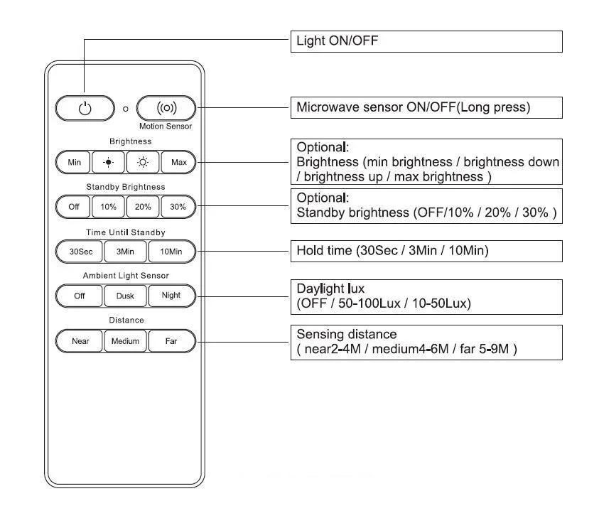 Diese Fernbedienung wird für die Rundleuchten Modelle Theia Sensor benötig Mircowave Sensor ON/OFF, Optional on Brightness ( min/down/up /max), Srandby brightness ( Off / 10% / 20% / 30% ) , hold time (30Sec / 3Min / 10Min), Daylight lux ( Off / 50-100lux / 10-50lux) , Sensing distance ( near 2-4M / Medium 4-6M , far 5-9M )