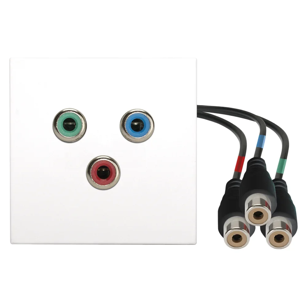 SYSWALL45 Cinch RGB -> KabelbuchsePlatte: 45x45mm Clip-IN-TechnikFarbe: reinweiß RAL9010---------------------------------Anschlüsse Vorderseite:3x Cinch female (rot, grün, blau)---------------------------------Anschlüsse Rückseite:3x Kabel 0.2m auf C…