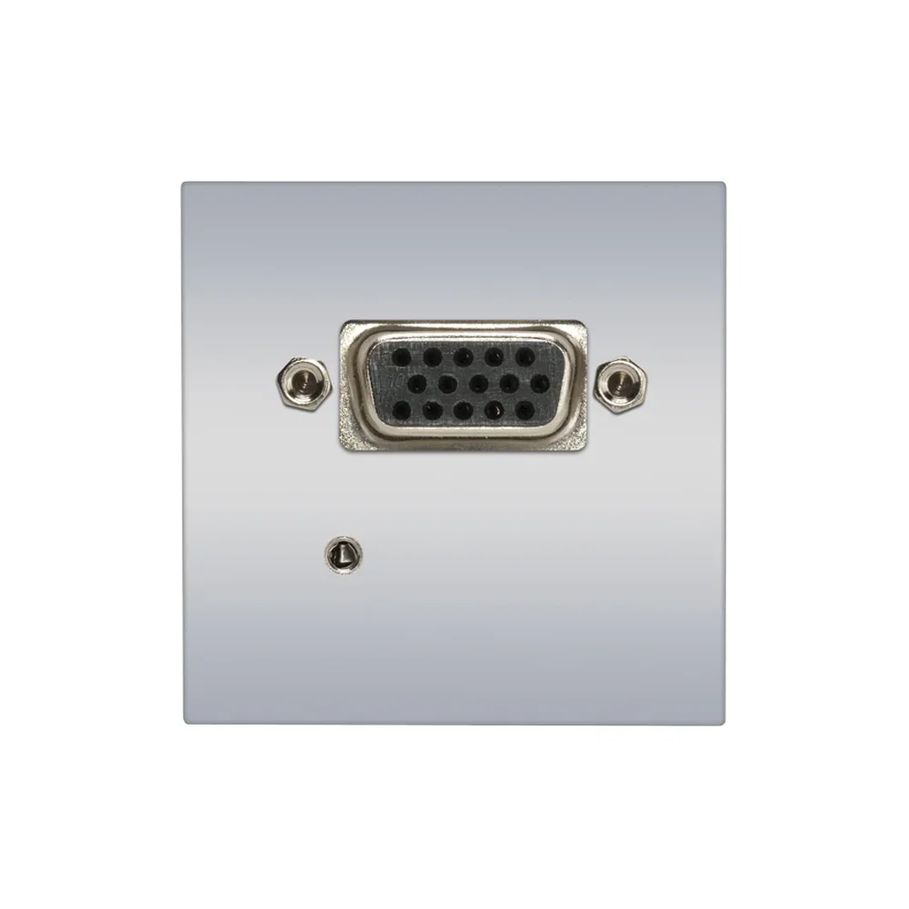 SYSWALL45 VGA+Minikl. -> KlemmblockPlatte: 45x45mm Clip-IN-TechnikFarbe: silber lackiert ---------------------------------Anschlüsse Vorderseite:1x VGA female1x 3,5mm Klinkenbuchse---------------------------------Anschlüsse Rückseite:1x 15fach Aufzug…