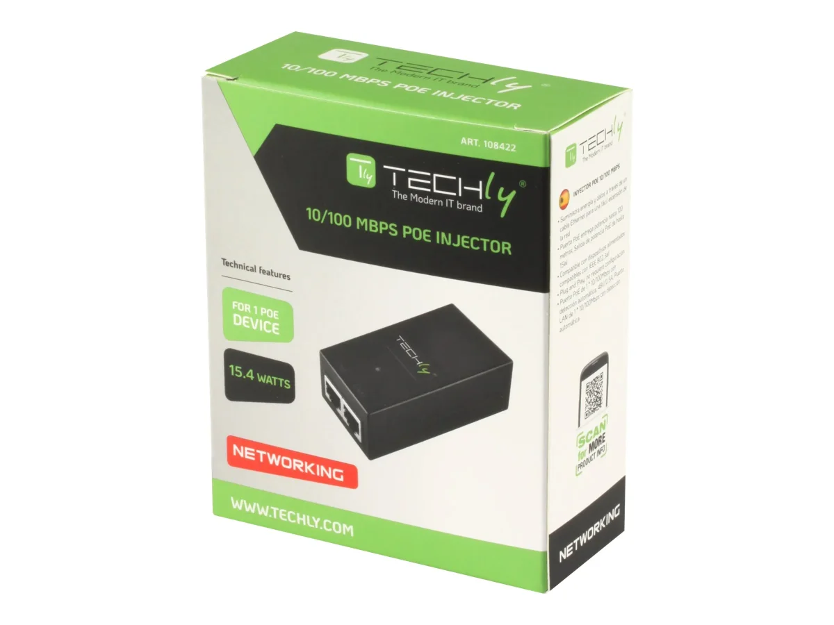 TECHLY PoE Injector Injektor 1 Port 48 V DC IEEE 802.3af kompatibel Class 3 PoE 15 Watt 10/100