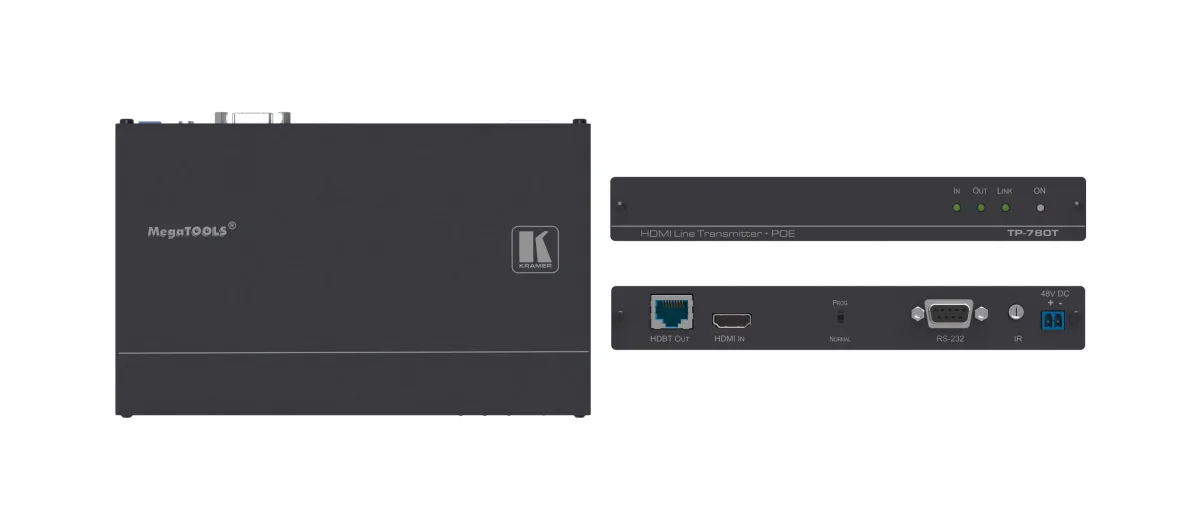 TP−780T ist ein Twisted Pair Übertrager für HDMI, bidirektionales RS−232 und IR. Er unterstützt Auflösungen bis 4K @60 Hz (4:2:0) UHD. Das Gerät wandelt HDMI, RS−232 und IR−Signale in ein TP−Signal und überträgt dies per HDBaseT an einen Empfänger, der das TP−Signal wieder zurück in 4K HDMI, bidirektionales RS−232 und IR wandelt. Für 4K @60 Hz (4:2:0) ist die Übertragungsreichweite 40 m über Kupferkabel, bei geringerer Auflösung auch darüber hinaus. Der TP−780T unterstützt PoE.