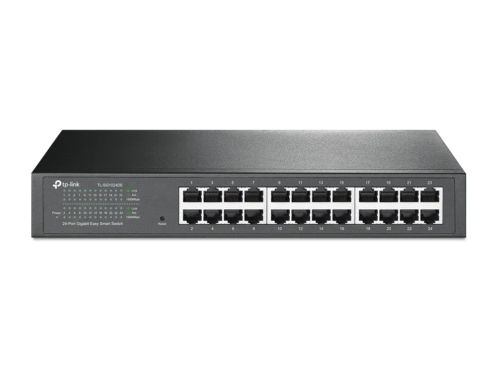 TP-Link TL-SG1024DE. Switch-Typ: Managed, Switch-Ebene: L2. Basic Switching RJ-45 Ethernet Ports-Typ: Gigabit Ethernet (10/100/1000), Anzahl der basisschaltenden RJ-45 Ethernet Ports: 24. Vollduplex. MAC-Adressentabelle: 8000 Eintragungen, Routing-/Switching-Kapazität: 48 Gbit/s. Netzstandard: IEEE 802.1Q, IEEE 802.1p, IEEE 802.3, IEEE 802.3ab, IEEE 802.3u. Rack-Einbau