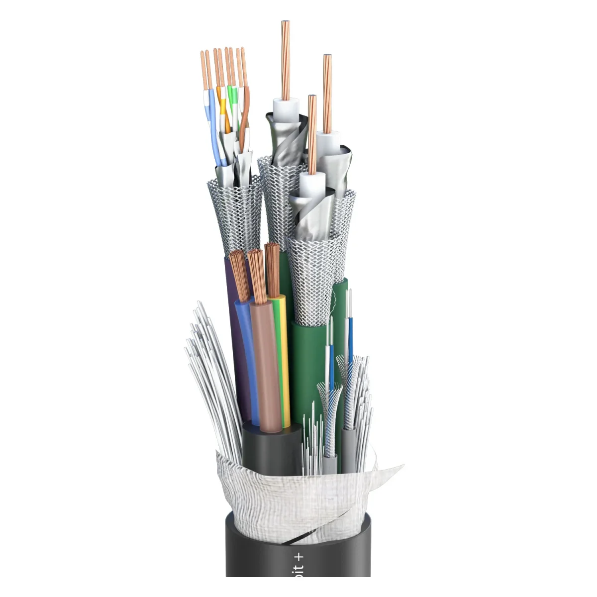 übt gleichzeitig die unterschiedlichen Disziplinen Ton-, Bild- und Datenübertragung aus – und dies mit konstanter Leistung auf langen Strecken. Über das integrierte 10Gbit-Network-Kabel können Sie zusätzlich digitale Audio-Signale (Ethersound etc.) mit hoher Performance senden. Für die Versorgung Ihrer Peripherie steht Ihnen zudem ein 3 x 2.50 mm² Lastelement zur Verfügung. Mit diesem Allrounder sind Sie bestens ausgerüstet mit den aktuellen Übertragungsstandards.