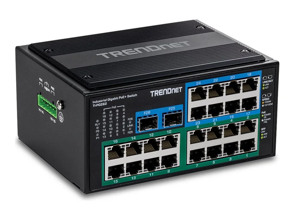 Entdecken Sie die Leistung und Zuverlässigkeit des TRENDnet Hardened Industrial Gigabit PoE+ Switch, der für die Anforderungen von Hochgeschwindigkeitsnetzwerken entwickelt wurde und gleichzeitig eine lange Lebensdauer in rauen Umgebungen gewährleistet. Mit einer Switching-Kapazität von 52 Gbit/s und einer Weiterleitungsleistung von 38,6 Mpps bietet dieser Switch eine effiziente Datenverarbeitung für ausgelastete Netzwerke. Er verfügt über 26 Gigabit-Ethernet-Ports, von denen 16 PoE+-fähig sind, und bietet damit flexible Anschlussmöglichkeiten für eine Vielzahl von Geräten. Das gehärtete Industriedesign, kombiniert mit einem Metallgehäuse und der Einhaltung zahlreicher Standards, einschließlich IP30 und IEEE 802.3at, stellt sicher, dass dieser Switch auch unter schwierigen Bedingungen zuverlässig funktioniert. Fortschrittliche Schutzmechanismen wie der 2KV-Überspannungsschutz und der 8KV-ESD-Protector sorgen dafür, dass die angeschlossenen Geräte vor Überspannungen und Spannungsspitzen geschützt sind. Mit einem großzügigen PoE-Budget von 480 W unterstützt er mehrere PoE-Geräte und ist damit eine ideale Lösung für Netzwerke, die eine zuverlässige Stromverteilung und einen unterbrechungsfreien Service benötigen.