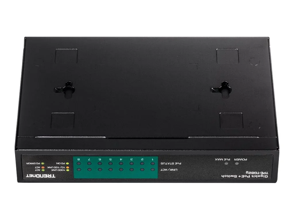 Der 8-Port Gigabit PoE+ Switch von TRENDnet, Modell TPE-TG82G, liefert Daten und Strom über bestehende Ethernet-Kabel an PoE-Geräte wie Access Points und IP-Kameras. Er unterstützt sowohl PoE- als auch PoE+-Geräte mit einer PoE-Gesamtleistung in Höhe von 61 W. Installieren Sie diesen stabilen Metall-Switch über Plug-and-Play für zuverlässiges PoE-Hochgeschwindigkeitsnetworking.