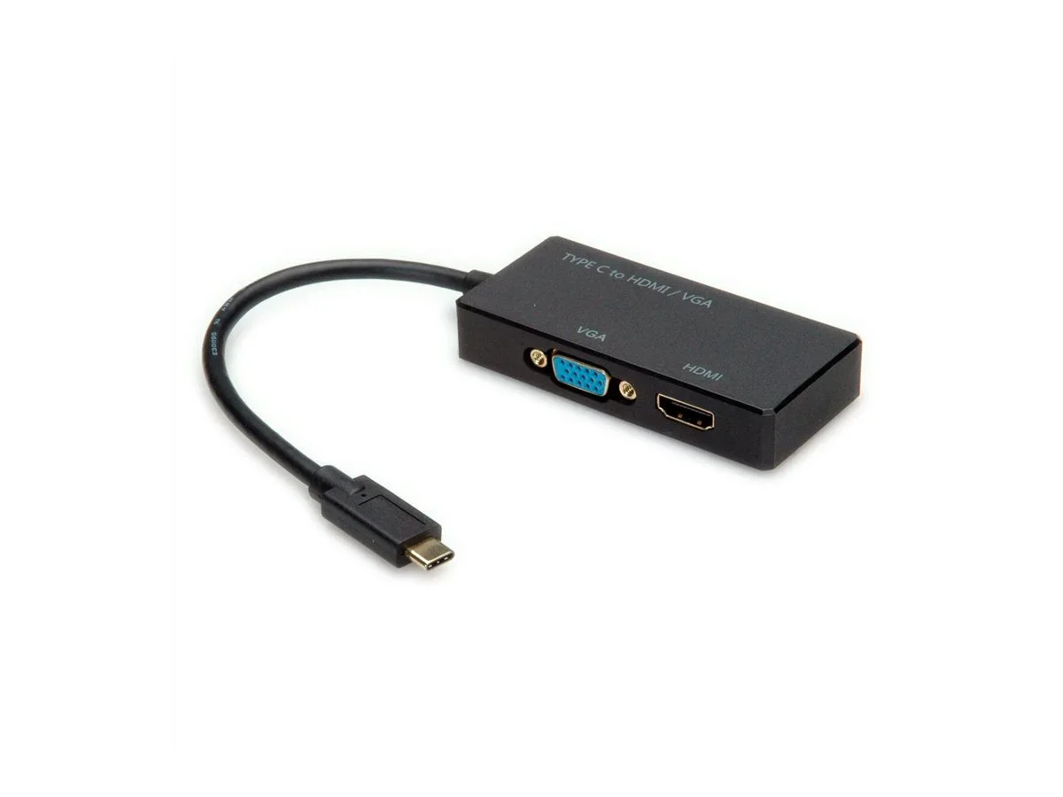 Schließen Sie an Ihr MacBook, Ultrabook, Notebook/Laptop oder Ihren PC mit USB Typ C Anschluss einen HDMI oder VGA Monitor oder einen vergleichbaren Projektor/Beamer an - mit einer maximalen Auflösung von bis zu 3840x2160 @30Hz! USB 3.1 / 3.2 Gen 2 Typ C zu HDMI/VGA Kabeladapter für Macbook, Ultrabook, Notebook/Laptop oder PC Damit können Sie Ihr Display auf z.B. Ihren HDMI-fähigen Fernseher oder einen HDMI- oder VGA-kompatiblen Monitor oder Projektor spiegeln Kein Netzteil erforderlich Anschlüsse: HDMI- und VGA-Buchse und Typ C Stecker Kabellänge: ca. 10 cm.