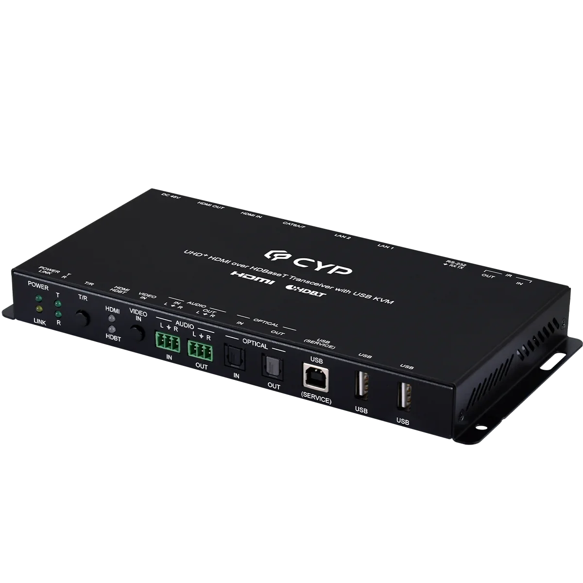HDMI 2.0 and DVI 1.0 compatible, HDCP 2.2 and HDCP 1.x compliant, HDBaseT 3.0 compliant (Backwards compatible with HDBaseT 2.0/1.0), Supports up to 4K UHD+ (18Gbps, 4K@50/60Hz 4:4:4, 8-bit) video input and output over both HDMI and HDBaseT, Supports 10-bit and 12-bit HDR (High Dynamic Range) input/output, HDBaseT extends video, audio and data over a single Cat.6A/7 cable and can reach distances up to 100m/328ft, HDBaseT feature support: HD Video and Audio, Gigabit Ethernet, Bidirectional PoH, Bi-directional audio (optical and analog), and Control (bidirectional USB/IR/RS-232 pass-through), 2 USB 2.0 Type-A device ports and 1 USB 2.0 Type-B host port, HDMI output functions as a local monitor when in transmitter mode