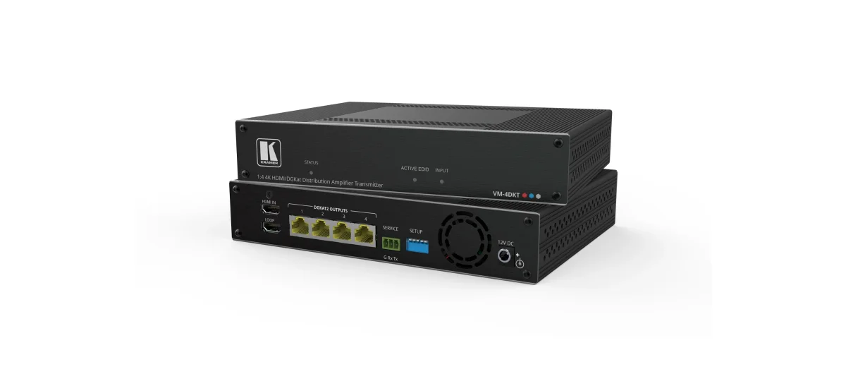 - High Performance Extension — Professional DGKat™ 2.0 distributor transmitter for providing long–reach signals and power over twisted pair copper infrastructures. VM–4DKT employs low–level video compression technology that delivers visually lossless performance for 4K@60Hz (4:4:4) HDR signals with near–zero latency.