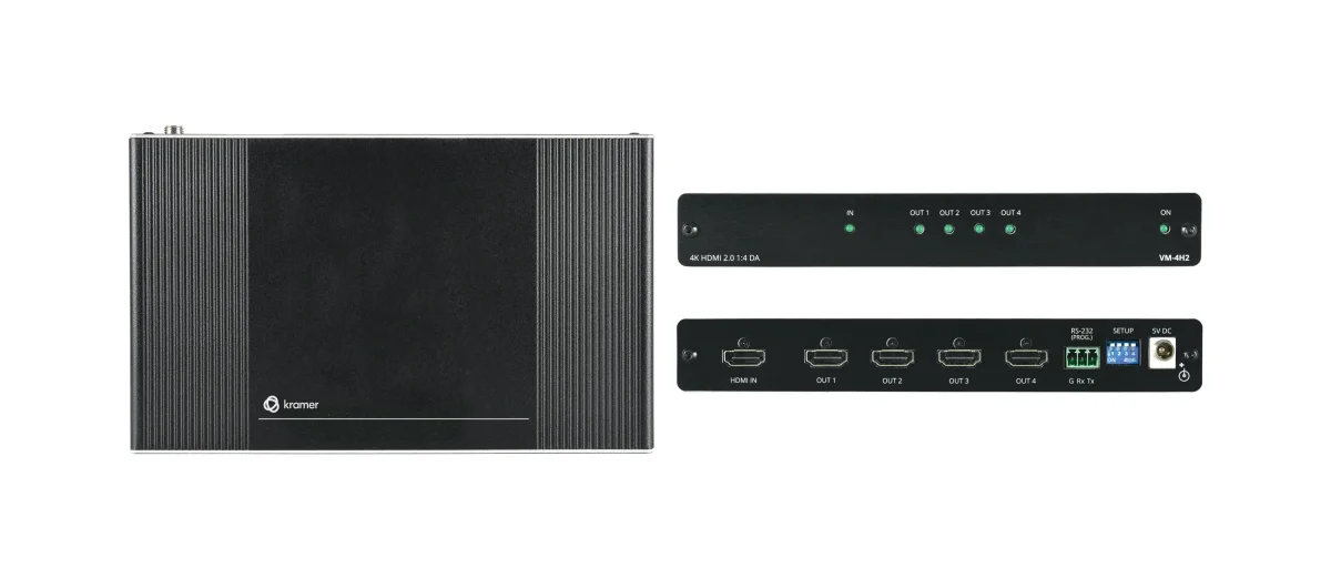 VM−4H2 ist ein 1:4−Verteilverstärker für bis zu 4K HDR, HDMI 2.0−Signale, die dem HDCP 2.2 Content Protection Standard entsprechen. Das Gerät hat einen HDMI−Eingang, entzerrt und synchronisiert das Signal und verteilt es an vier identische Ausgänge.
