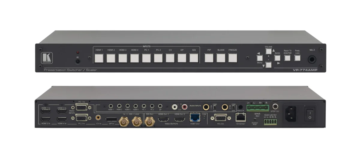 VP−774AMP ist ein Hochleistungs−Präsentationsumschalter und −Scaler mit 9 Eingängen: 1x 3G HD−SDI, 1x DisplayPort, 1x Comp.Video, 2x Computergrafik, 4x HDMI. Das gewählte Videosignal wird skaliert, Audio eingekoppelt und das Signal gleichzeitig zusammen mit S/PDIF und symmetrischem Audio an zwei HDMI−, einem 3G HD−SDI und einem HDBaseT−Ausgang ausgegeben. Das Gerät enthält ebenfalls einen Audio−Verstärker mit direkten Lautsprecher−Ausgängen.
