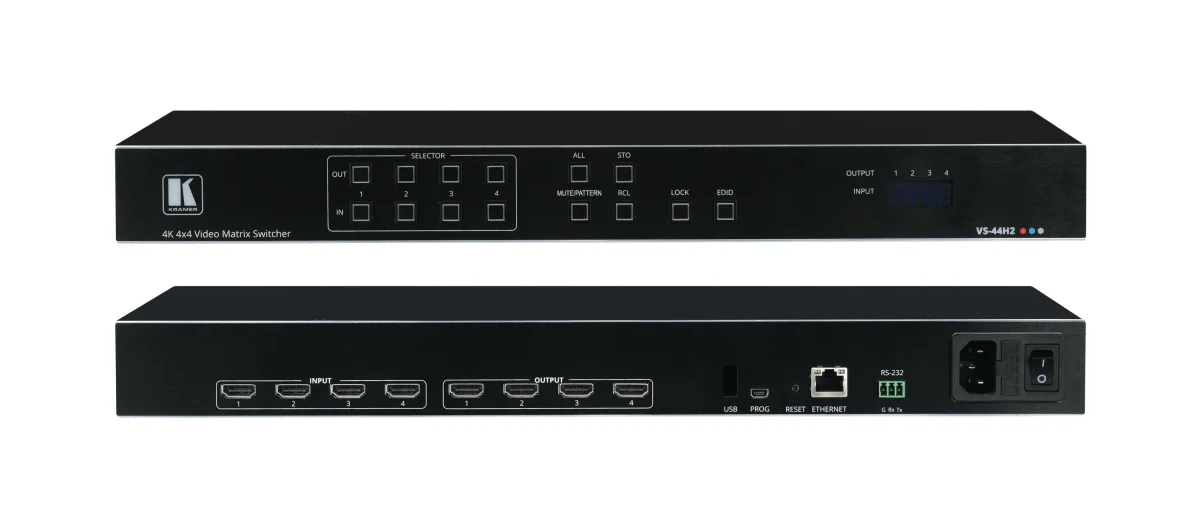 VS−44H2 ist eine 4x4 Hochleistungs−Matrix für 4K@60Hz (4:4:4) HDR−Signale. VS44H2 taktet die Signale neu und entzerrt sie. Von jeder der vier HDMI−, HDCP−konformen Quellen (auswählbar) können Daten entweder zu jeder Anzeige einzeln oder zu allen Anzeigen gleichzeitig geroutet werden.