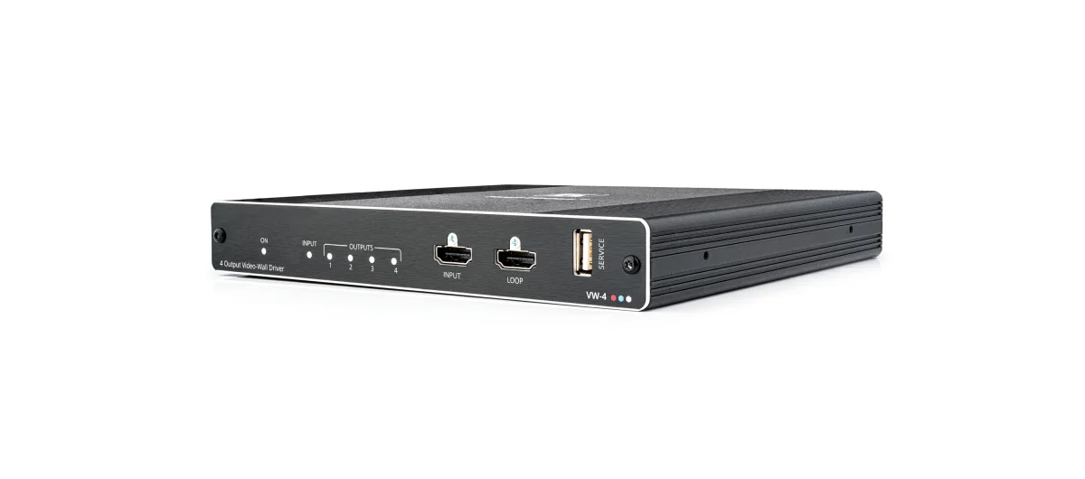 VW−4 ist ein Videowand−Treiber mit vier Ausgängen für die schnelle und leichte Konfiguration und Steuerung von Video−wänden. Mit nur einem VW−4−Gerät können Sie jede Videowandkonstellation mit bis zu vier Bildschirmen einrichten, wie z.B. 2x2, 4x1, 1x4, 2x1, 3x1. Durch den Anschluss weiterer VW−4−Geräte können Sie Videowände jeder Größe und in jeder Konfiguration mit bis zu 64 Anzeigen einrichten. Nutzen Sie die VW−4 Control Software, um einzelne Geräte oder Konstellationen aus mehreren Geräten über Ethernet oder RS−232 zu konfigurieren oder nutzen Sie die Möglichkeit der Schnellkonfiguration von Grundeinstellungen über lokale DIP−Schalter.