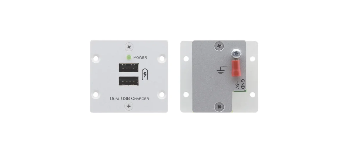 - 2x USB–Ladeausgang (5 V) — 20 W/4 A Gesamt für beide Ausgänge zum Aufladen von mobilen Smartphones und Tablets.