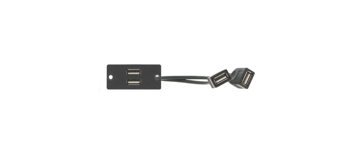 WU−2AA ist ein einfacher Wall−Plate Einsatz vorn mit zwei USB 2.0 Typ A Buchsen und hinten mit zwei gleichen Buchsen an kurzen Kabeln.