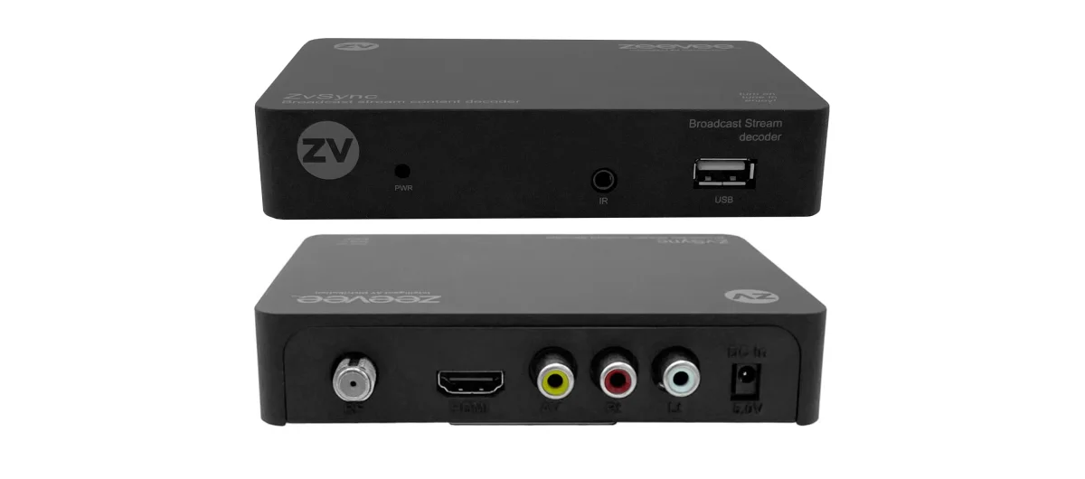 ZvSync−EU is a digital DVB−T tuner/decoder providing video output via composite with analog audio or HDMI with embedded digital audio. Includes IR pigtail, IR remote control, and power supply.