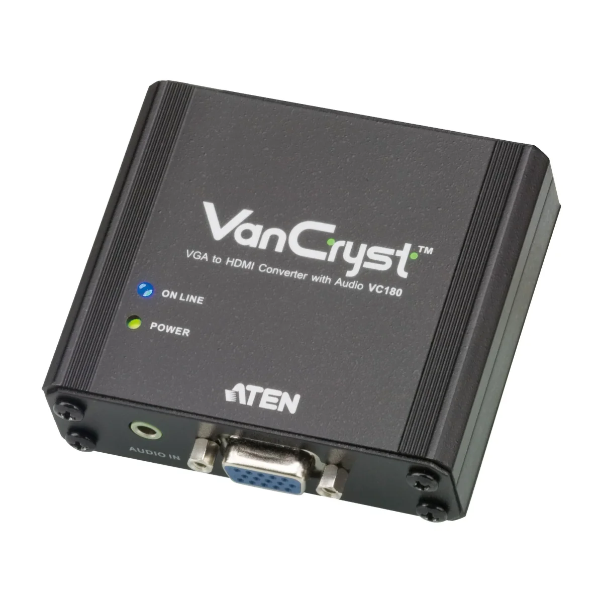 Der VC180 ist ein VGA-zu-HDMI-Konverter mit Audio. Der VC180 erhält seine Stromversorgung aus dem VGA-Anschluss, kann aber auch über das mitgelieferte Netzteil versorgt werden.