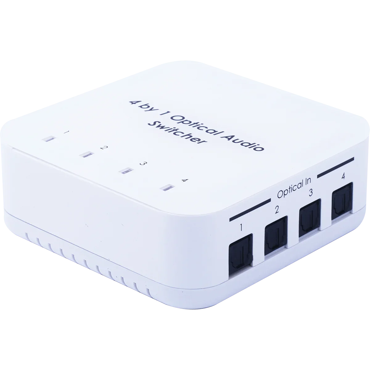 The 4 by 1 Optical Audio Switcher has four optical inputs and one optical output and allows users with multiple optical sources to switch between sources without delay. The device has a built-in last memory function and IR remote control which provides a more user-friendly experience