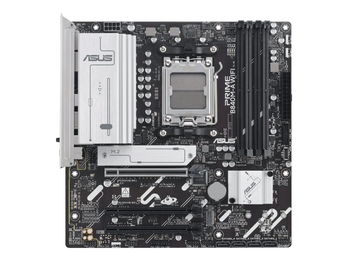 Das ASUS PRIME B840M-A WIFI-Motherboard bietet eine robuste Plattform für Hochleistungsrechner mit fortschrittlichen Konnektivitätsoptionen. Es ist mit einem AMD B840-Chipsatz ausgestattet und unterstützt Ryzen-Prozessoren, wodurch eine leistungsstarke Performance und Kompatibilität mit der Ryzen 7000/8000/9000-Serie gewährleistet ist. Das Motherboard verfügt über einen Micro-ATX-Formfaktor, der ausreichend Erweiterungssteckplätze bietet, darunter 4 DIMM-Steckplätze für DDR5-SDRAM mit Geschwindigkeiten von bis zu 3800 MHz (O.C.). Mehrere interne Schnittstellen wie USB 3.2 Gen und Audioanschlüsse verbessern die Flexibilität und Funktionalität des Systems.