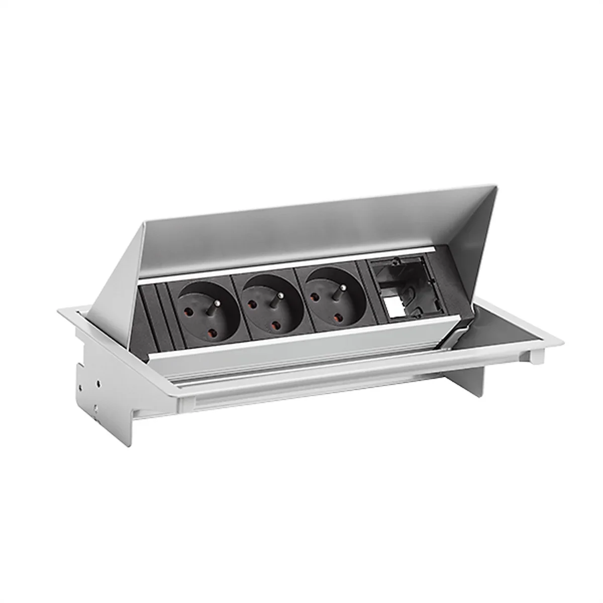 Set CONEO weißaluminium bestehend aus: 1xCONEO Einbaurahmen 911.300 und 1xCONEO Steckdoseneinheit 912.301, 3xUTE Steckdosen schwarz mit erhöhtem Berührungsschutz 1xCustom Modul leer Stromeingang: 0,2m H05VV-F 3G1,5mm² schwarz mit GST18 Stecker verpackt im Karton.