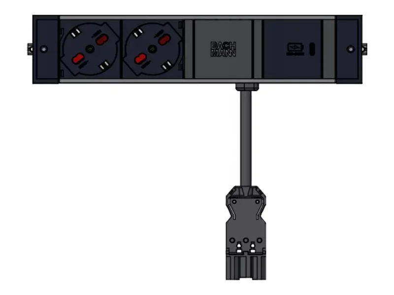 Die Bachmann DESK RAIL 941.001 ist mit 2 Steckdosen, 1 USB Doppelcharger und 1 Custom Modul zur individuellen Bestückung ausgestattet. Die Befestigung gelingt einfach durch das Anschrauben an der Frontseite, während Daten- und Stromzuleitungen von unten erfolgt. Die Bachmann DESK RAIL ist, dank der Universalaufnahme, nahezu mit allen Standard-Relingsysteme kompatibel.