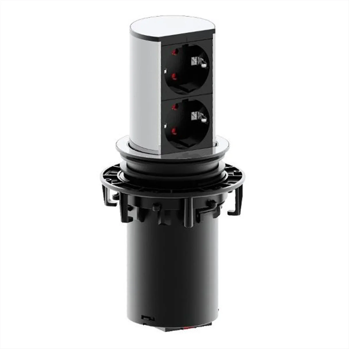 2-fach Steckdosenturm aus Kunststoff/Edelstahl, ein/ausfahrbar auf Fingerdruck