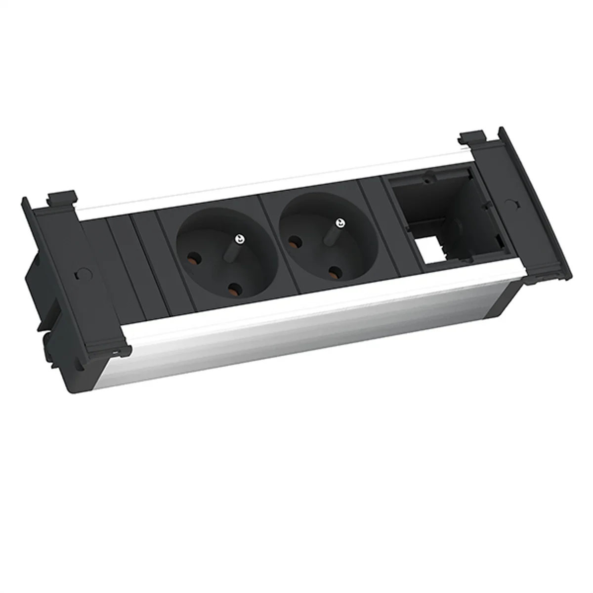 KAPSA S Steckdosenleiste 2xUTE Steckdosen Frankreich 1xCustom Modul leer Zuleitung: 2,0m H05VV-F 3G1,5mm² schwarz mit beigelegtem Schutzkontakt-Montagestecker, Optionales Zubehör: 1xDeckel verpackt im Karton.