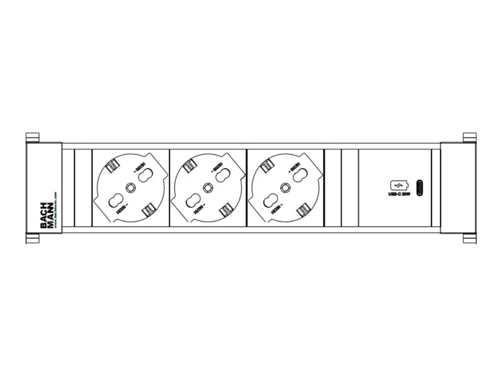 Bachmann POWER FRAME - Steckdosenleiste (Unterputz-Montage) - mittel - Wechselstrom 250 V - Eingabe, Eingang GST18i3 - Ausgangsanschlüsse: 3 (24 pin USB-C, 3 x CEI 23-50 P 40) - 20 cm Schnur - Schwarz, Silber