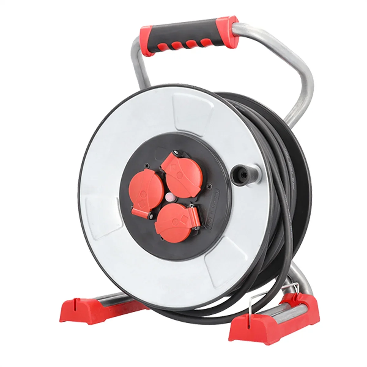 Profi-Kabeltrommel IronCoat Trommelkörper aus feuerverzinktem Stahlblech mit Spezial-Schutzisolierung 3xSchutzkontaktsteckdosen inkl. Klappdeckel IP44 40,0m Gummischlauchleitung H07RN-F 3G 1,5mm² mit Schutzkontaktstecker CEE7/7 Stabiles, stoßdämpfendes Profi-Doppelrohrgestell mit Sterngriffbremse Ergonomischer, rutschfester 2-Komponentengriff Integrierte Leitungsführung Inklusive Thermoschutzschalter Für die Verwendung im Freien und auf Baustellen Verpackt im Karton