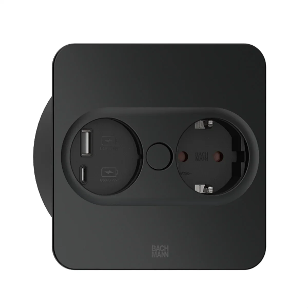 TWIST 2 Metallische Abdeckscheibe eckig schwarz matt, ähnlich RAL 9005 30GE seidenmatt, 1xSchutzkontaktsteckdose schwarz mit erhöhtem Berührungsschutz 1xUSB A/C 22W Charger Zuleitung 2,0m H05VV-F 3G1,5mm² schwarz mit Aderendhülsen und beigelegtem Schutzkontakt-Montagestecker verpackt im Karton