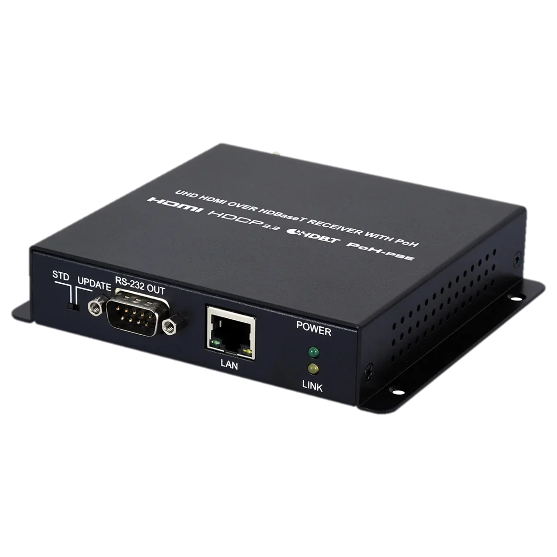 HDMI with 3D & 4K support, DVI 1.0 compatible, Supports resolutions up to 4K@50/60Hz (4:2:0, 8-bit), Supports CEC bypass, Simultaneous transmission of uncompressed video, audio and data over a single 100m/328ft Cat.5e/6/7 cable at 1080p60 and 70m/230ft at 4K, HDBaseT feature support: HD Video and Audio, 100BaseT Ethernet, 48V PoH, and Control (bidirectional IR/RS-232 pass-through), Supports standard 48V PoH from Receiver (PSE) to Transmitter (PD) (compatible Transmitters only), Notes:The 48V PoH function is designed to power compatible Transmitter units only. Non-PoH Transmitters will need their own power supply. Other brands of Transmitter may not be compatible., The use of “Premium High Speed HDMI” cables is highly recommended for displaying 3D and 4K content and compatible display equipment is required.